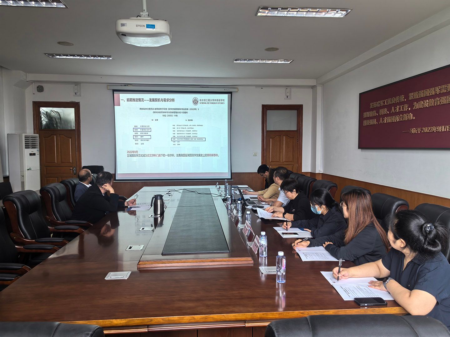 邢海明大使出席哈尔滨工程大学区域国别学一级学科博士点建设专家咨询会,外国学院院长朱殿勇汇报了区域国别学一级学科博士学位点建设情况。