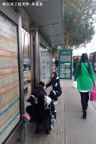 到达公交站牌后志愿者们纷纷拿起了抹布,将站台的站牌玻璃擦干净,每个人都手持不同的工具,开始了本次的清扫活动。有的人用小刀将紧贴在站牌上的小广告去除;有的人用扫帚将站台的垃圾扫到垃圾桶旁边方便环卫工人清扫;有的人一手报纸一手抹布,将站牌玻璃擦得干干净净;有的人穿行在人群中间提醒大家注意脚下卫生……大家都忙的不亦乐乎。